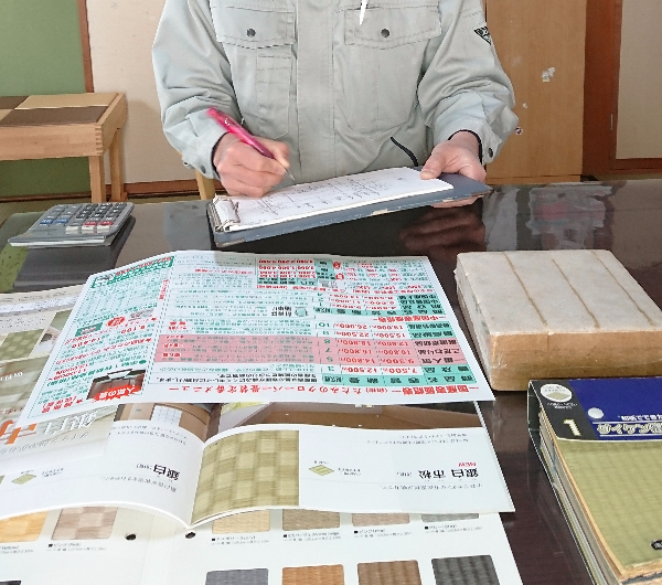 当社よりスタッフがお客様のもとへ畳表や畳縁のサンプルを持参してお話を伺い、お見積もりに参ります